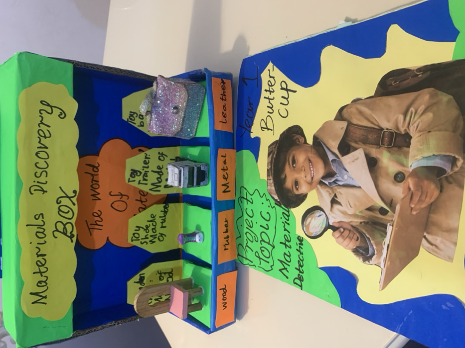 A scholastic display is present on a light-colored surface in Lekki, Nigeria. The scene features two primary objects: a "Materials Discovery Box" and an accompanying project booklet. The "Materials Discovery Box" is a hand-crafted educational aid, likely constructed from cardboard, painted green on its upper edge and blue internally. It displays four distinct compartments, labeled in orange as 'wood,' 'rubber,' 'metal,' and 'leather.' Each compartment contains a representative object and a yellow cutout label: a small wooden chair for 'wood,' a miniature toy shoe for 'rubber,' a toy truck cabin for 'metal,' and a small glittery handbag for 'leather.' A central orange cutout within the box reads 'The world Of materials' (partially obscured), and a yellow banner across the top states 'Materials Discovery BOX.' Directly in front of and slightly to the right of the box is a project booklet with a blue and yellow cover. The booklet displays the title 'Project Topic: Material Detective' on the left and 'Year 1 Butter-cup' on the right. A prominent image on the cover depicts a smiling young boy dressed as a detective, wearing a trench coat and fedora, holding a magnifying glass and a clipboard.