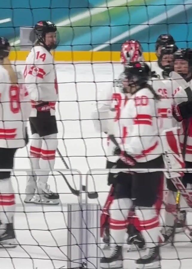 - "A group of women's hockey players, wearing the red-and-white maple leaf jerseys of the Canadian national team, are lined up on the ice, seen through the safety netting surrounding the rink" by FM-iCfSu2, licensed under CC BY 4.0