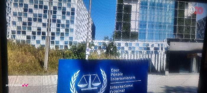 The image displays the exterior of the International Criminal Court (ICC) complex, located in The Hague, Netherlands. In the foreground, a prominent dark blue sign features the ICC emblem, which combines the scales of justice with a laurel wreath, and bears the white text "Cour Pénale Internationale" and "International Criminal Court". Behind the sign, a strip of unkempt, yellowish-green vegetation, likely dry grass or bushes, is visible. The background features two distinct multi-story buildings under a clear blue sky. The building on the left exhibits a facade composed of numerous square, reflective windows arranged in a grid pattern. The building on the right is more modern, characterized by large, reflective glass panels, some of which incorporate vertical green elements. A partially visible red and white logo is present in the upper right section of this building. A slender vertical pole stands between the vegetation and the left building. The scene is brightly lit by daylight. No individuals or specific actions are depicted. An overlay of "police kombo ❤️❤️" text is visible in the lower-left corner of the image.