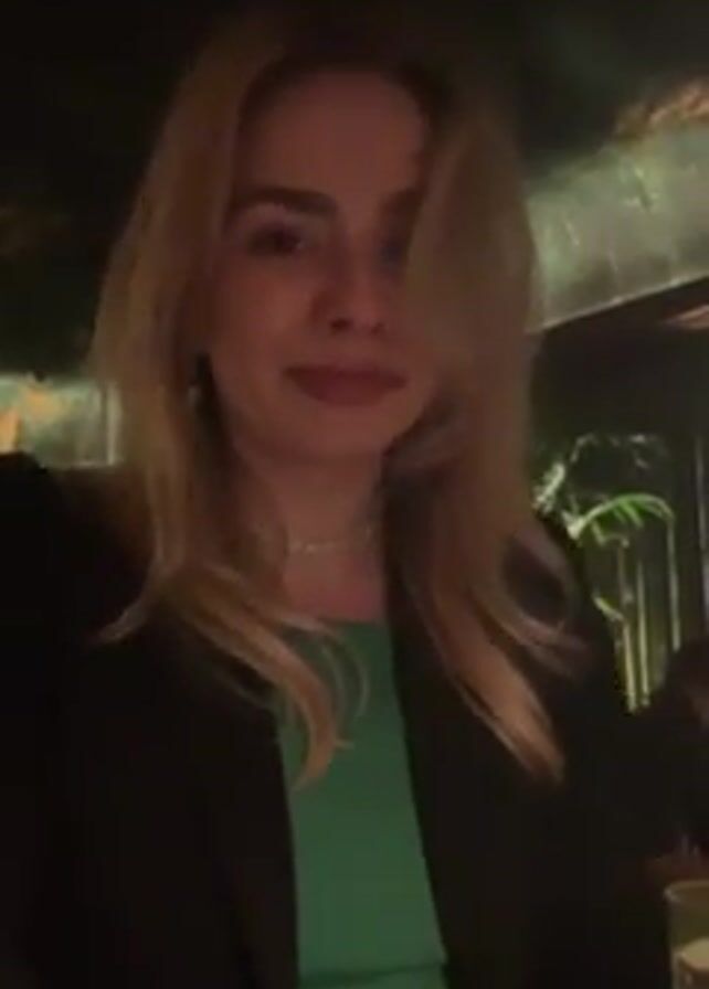 A young blonde woman is the primary subject of the video, positioned indoors at a dimly lit restaurant