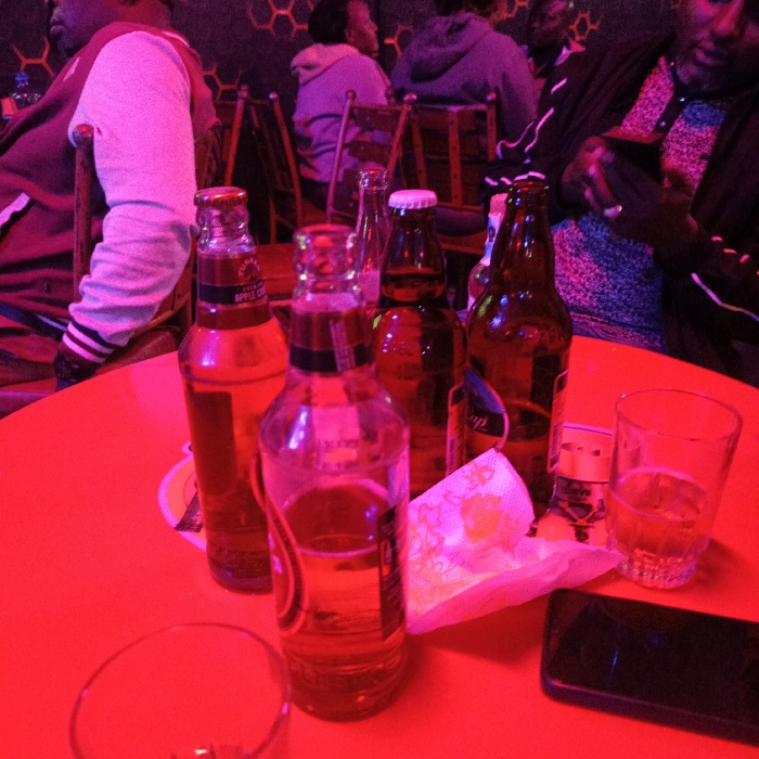 The image displays an indoor scene, likely a bar or nightclub, bathed in dim, pervasive red lighting. In the foreground, a red table holds several items. Five glass bottles are visible: one clear bottle containing amber liquid, partially consumed, with "Apple Cider" discernible on its label; two brown glass bottles with caps (one silver, one white); and two other brown glass bottles, one with a blue label. Two clear drinking glasses are present, one mostly empty and one containing a small amount of amber liquid. A crumpled white paper napkin rests on the table, alongside a dark-colored smartphone lying face down. In the midground and background, several individuals are seated at tables on wooden chairs. On the left, a person wearing a light-colored jacket with dark striped cuffs is visible from the back. On the right, a person in a dark jacket over a patterned top is partially seen from the side. Additional figures are indistinctly visible further back, including one wearing a grey hoodie. The wall behind the patrons features a dark, textured pattern resembling hexagons. Based on the beverage brands, specifically "Apple Cider" and bottle styles typical of local breweries, the location is identified as a bar or club in Nairobi, Kenya.