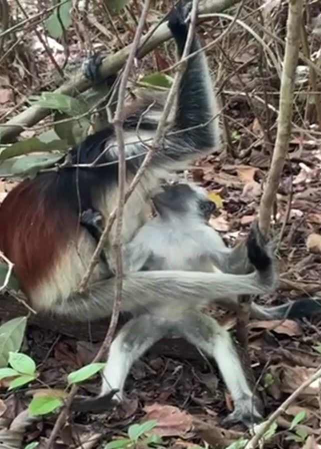 monkey in a forest. The monkey has black, white, and brown fur. The monkey is in the branches of a tree. The monkey is holding a baby monkey. The baby monkey is grey. The mother monkey is climbing higher into the tree. The trees are thin and have a lot of green leaves. The ground is covered with leaves and twigs. There is talking in the background.