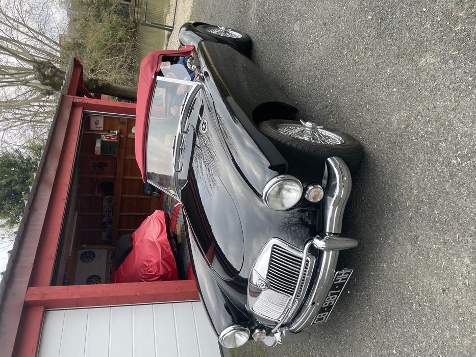 An outdoor scene in Vierzon, France, depicts a black classic MG MGA convertible with a red soft top