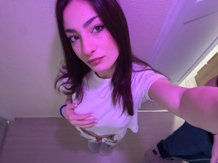 The image depicts an indoor scene situated within Strasbourg, France, characterized by strong magenta ambient lighting. A young adult female, with long dark hair, dark eyes, and dark lipstick, is centrally positioned, looking directly into the camera. She wears a white short-sleeved t-shirt, a silver-colored necklace with a pendant, and patterned light-colored loungewear with light-colored slippers. A blue wristband is visible on her left wrist. Her right hand rests on her upper chest. Her left arm is extended towards the viewer, indicating she is holding the camera. In the lower right corner, the left leg and foot of a second individual are partially visible, clad in dark trousers and a light-colored shoe. The immediate environment consists of a plain light-colored wall and a light-colored floor, possibly wood or tile, all tinted purple by the lighting. A white door frame or ceiling molding is visible in the upper right, above which indistinct brown objects are partially visible.