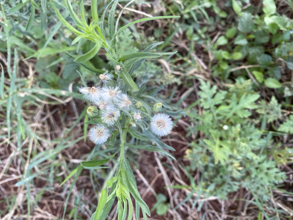 A close-up shot focuses on a cluster of flowering plants amidst foliage and ground cover. The plants exhibit lance-shaped green leaves and spherical, dandelion-like seed heads with white, feathery bristles. Some seed heads are still in bud. Surrounding vegetation includes grasses and other broadleaf plants. The background consists of exposed soil and decaying plant matter.