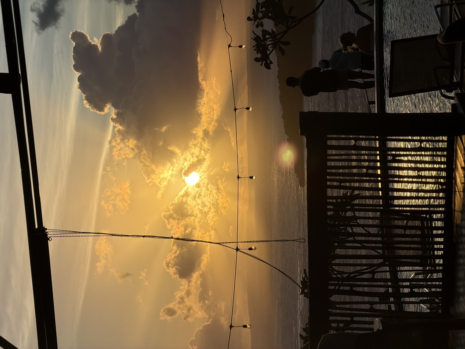 The scene depicts a sunset over a large body of water, likely a sea or ocean, viewed from an elevated vantage point in the city of Sakti, Indonesia. The sky is dominated by golden-orange hues, with the sun appearing as a bright, circular disc partially obscured by clouds in the upper-middle left, from which visible rays of light emanate. Various clouds are scattered, including a large, dark cumulus cloud silhouetted against the bright sky on the upper right. In the foreground, structural elements are predominantly silhouetted. Dark horizontal beams span the top of the frame. A dark, beaded chain hangs vertically from an unseen point above. A string of at least five incandescent bulbs, appearing unlit, is stretched horizontally across the mid-ground, above the water. A dark, vertical-slatted wooden or bamboo railing runs across the lower-middle portion of the image, separating the viewing platform from the water. The water below reflects the golden light, creating shimmering patterns visible through the railing. On the right side of the frame, three silhouetted human figures are observed standing, facing away from the viewer, and looking towards the sunset and the water. The leftmost figure is an adult, positioned alongside two smaller figures to their right, consistent with children or shorter adults, also observing the vista. Partial views of dark outdoor furniture, possibly lounge chairs, and a silhouetted plant with distinct leaves are visible in the lower right foreground.