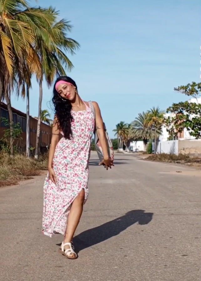 A young woman is standing on a paved road, flanked by palm trees, on a bright, sunny day. She is wearing a long, floral sundress with a slit, along with white sandals and a pink headband. She also has a large, patterned tote bag slung over her shoulder. At the beginning of the video, she is facing the camera, then turns to the side, smiles, and begins to walk down the road, away from the camera. Halfway down the road, she turns around and waves. The environment appears to be a coastal area with buildings visible in the distance. The sky is clear blue, and the lighting is bright, creating a long shadow of the woman on the road.