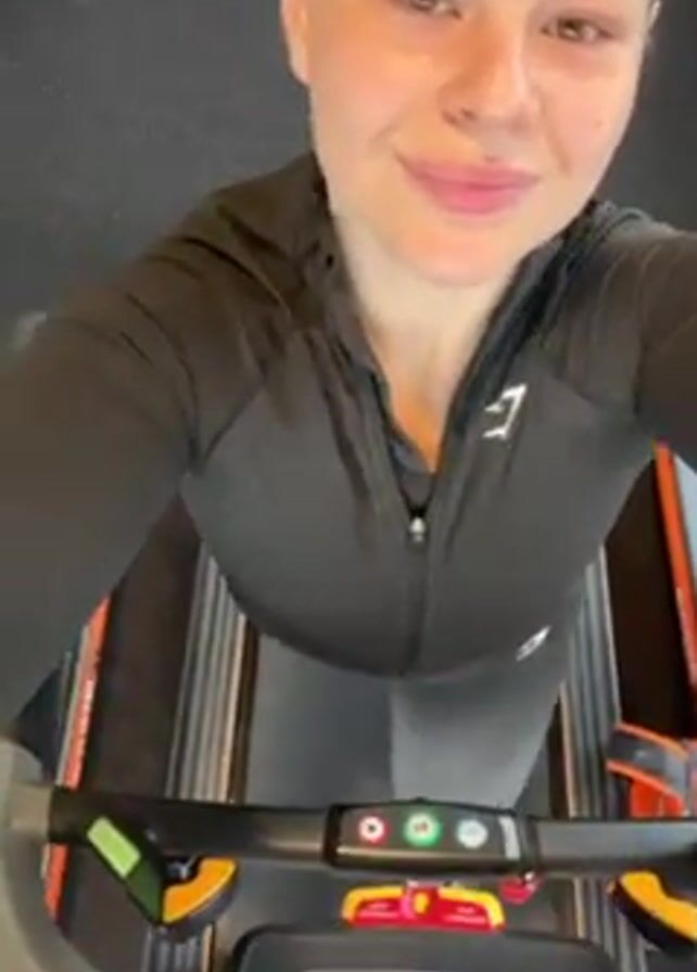 A woman takes a selfie video while on a treadmill. The woman has fair skin and brown hair pulled back in a bun. She is wearing a black athletic jacket with a gray logo and gray leggings. She smiles into the camera as she is walking on the treadmill. The treadmill has an orange trim. The background shows the gym area with other treadmills and equipment. There is a window to the side. Someone can be heard talking in the background in another language.