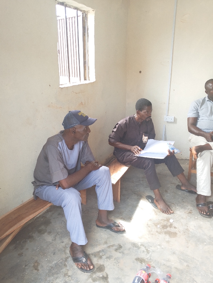 This image depicts an indoor scene in Zango-ndaji, Nigeria, featuring three adult males gathered in a sparsely furnished room
