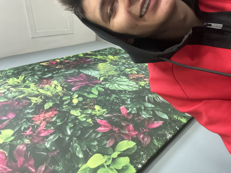 The scene depicts an indoor environment in Sliven, Bulgaria. A smiling individual is partially visible on the right side of the frame, from the mid-face down to the chest. The person is wearing a red long-sleeved garment, possibly a sweatshirt or hoodie, layered over a black hooded jacket. The black jacket's hood is up, framing the person's face, and a zipper pull with the text "ftair" is visible. To the left and behind the individual, a large rectangular wall hanging or panel displays a dense pattern of tropical foliage, featuring various shades of green leaves interspersed with distinct clusters of red and purple leaves. The wall adjacent to this decorative panel is painted a light blue-grey. A white ceiling with a recessed rectangular fixture is visible in the upper right portion of the image. The individual is oriented towards the camera, smiling.