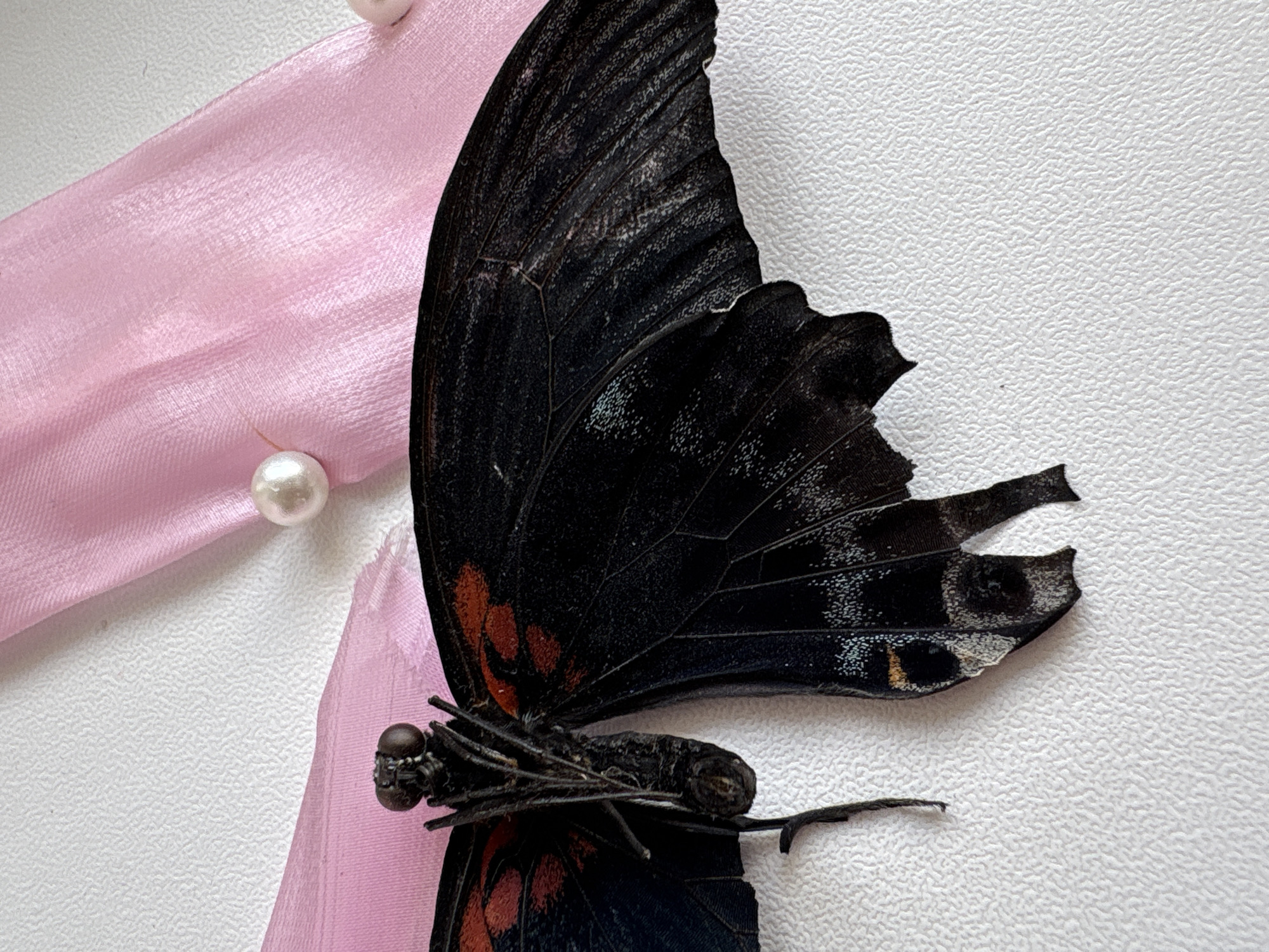 A close-up photograph shows the preserved body of a butterfly pinned to a white textured surface. The butterfly's wings are predominantly black, with some orange markings near the body. A light pink ribbon and two small pearl-like spheres are visible to the left of the butterfly. No people or actions are visible. There is no information in the image that definitively places it in Chaikovsky, Russia.