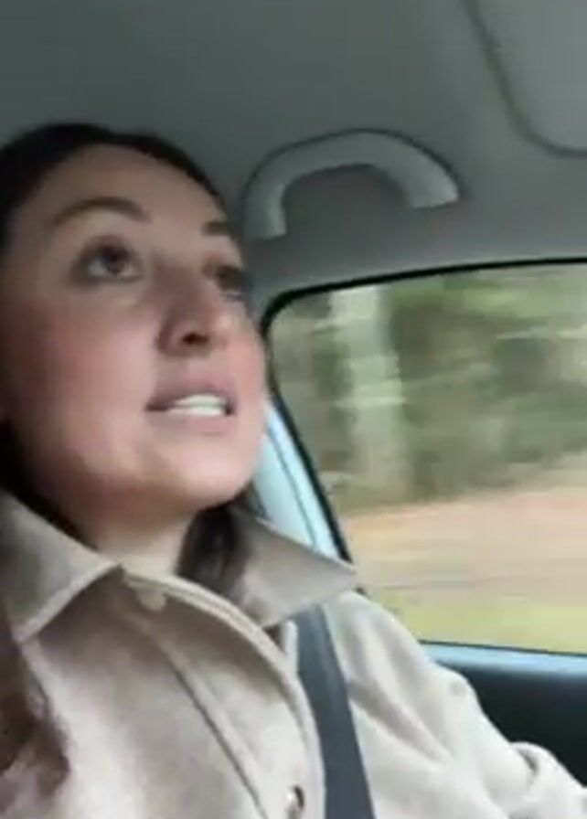 woman driving a car. She is wearing a tan jacket and a seatbelt. She is looking at the camera and singing along to music. The background shows trees passing by through the car window. The car has a sunroof.