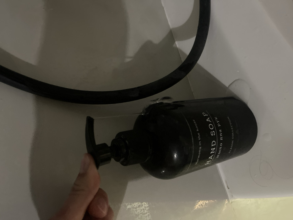 This image, taken in the city of Семибратово, Russia, captures a close-up view of a hand dispensing liquid from a pump bottle in what appears to be a bathroom setting