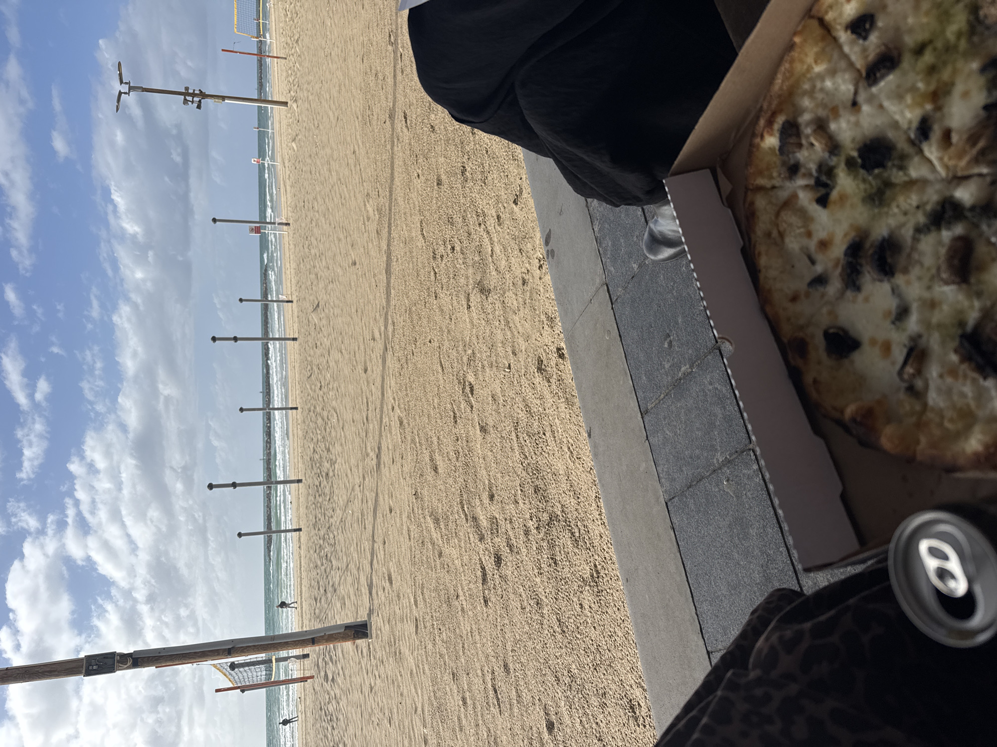 view of a sandy beach next to a paved area with a person holding a pizza box and a can