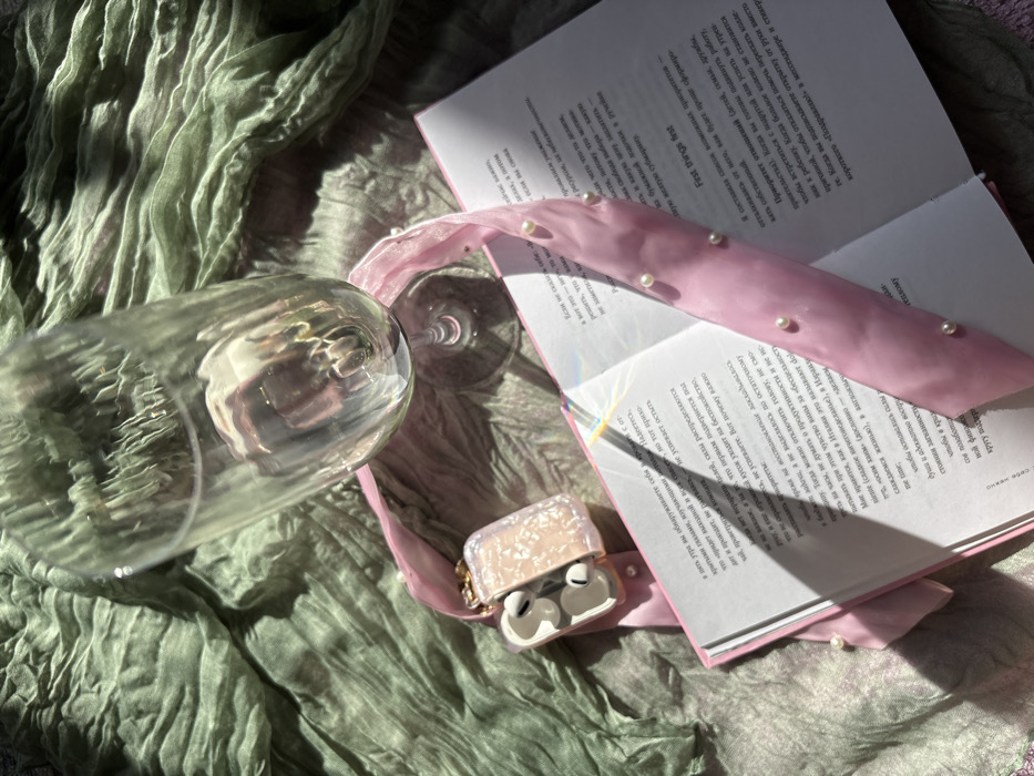 The scene captures a still life arrangement, presumably indoors, though the specific location within Chaikovsky, Russia, is not discernible. In the upper center, a clear, empty stemmed glass, possibly a champagne flute, is positioned diagonally. Below it, an open book with white pages displays text; the left page features Cyrillic script, while the right page shows a mixture of Cyrillic and English text, with the phrase "First things first" clearly legible. A light pink ribbon bookmark, adorned with small white pearls, is inserted into the book, running diagonally across the open pages. To the left of the book, an open, translucent, iridescent light pink case containing two grey wireless earbuds is visible, seemingly attached to a decorative keychain. All objects are arranged on a rumpled, textured fabric of a muted olive-green or sage-green color. Natural light illuminates the scene, casting soft shadows and producing a prismatic lens flare near the book's spine. No individuals are present.