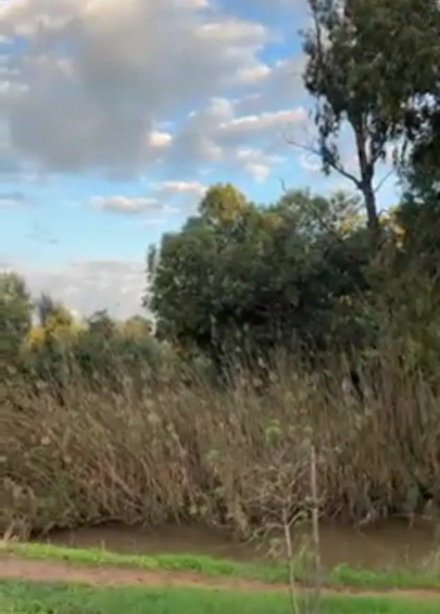 The camera pans slowly across a nature scene. A narrow stream of water flows along a grassy bank, lined with tall, dried reeds. A dirt path runs parallel to the stream. Several trees are visible in the background, some with yellowing leaves. The sky is blue with scattered white clouds. The overall light suggests either early morning or late afternoon. Someone can be heard speaking in the background.