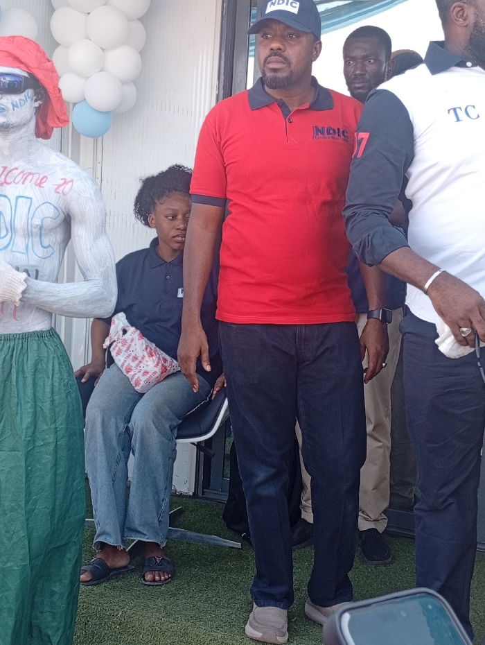 A group of people are standing together. The man in the foreground is wearing a red polo shirt with "NDIC" on it, dark blue jeans, and a baseball cap that also says "NDIC". To his left is a seated woman in a dark blue shirt, a person painted silver with "NDIC" written on their body, and another man in a white shirt with "TC" on it. There is a cluster of white and light blue balloons in the background. The individuals appear to be part of an event or gathering.
