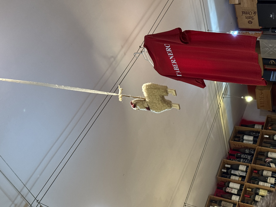 The image displays an upward-angled view inside a commercial establishment in Madrid, Spain. Suspended from a light-colored ceiling are two primary decorative objects. To the left, a small, cream-colored, plush llama figurine with red embellishments around its neck hangs by a section of twine and a wider, light-colored ribbon. To its right, a red short-sleeved t-shirt is suspended on a white plastic hanger, bearing the word "TABERNERO" printed horizontally in white capital letters. Several thin, dark wires run across the ceiling. In the lower left background, numerous wine bottles are systematically arranged within stacked wooden crates, forming a retail display. Additional light fixtures and indistinct background elements are visible further in the background.