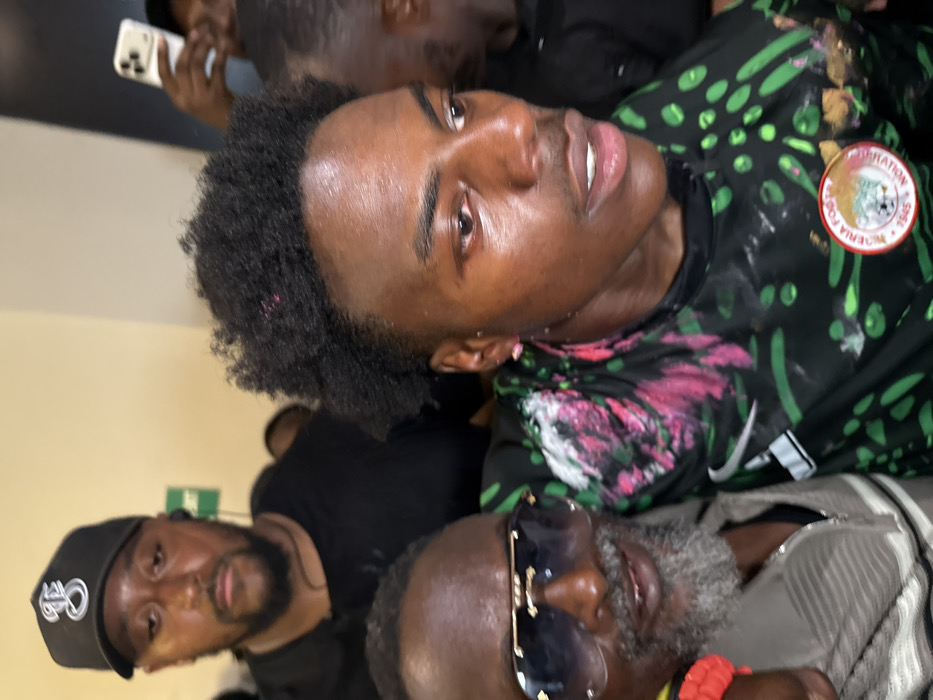 A group of people are captured in an indoor shot. A young, dark-skinned person with short, curly hair and wearing a green and black patterned jersey is prominently in view. To their left and below are two more individuals: one wearing a black cap and a black shirt and the other, an older man with a grey beard and large sunglasses. A hand holding a phone appears in the background on the left. The overall composition seems candid, potentially capturing an event or gathering.
