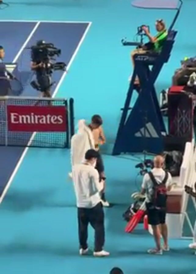 In a medium shot taken from an elevated position, a tennis player is shown removing his white jacket while on the tennis court. The man is wearing dark-colored pants, and underneath the jacket, he is shirtless. Several people surround him, including two cameramen with large cameras and other individuals in white shirts. To his right, a taller chair sits with someone in a green shirt on it, presumably a judge of some kind. The surface of the court is a light blue color with white lines. An "Emirates" sign is also visible on the left side of the shot. In the foreground, a man in a black shirt with "Seguridad" on the back is standing and facing away from the camera. The overall atmosphere suggests the scene is taking place after a match.