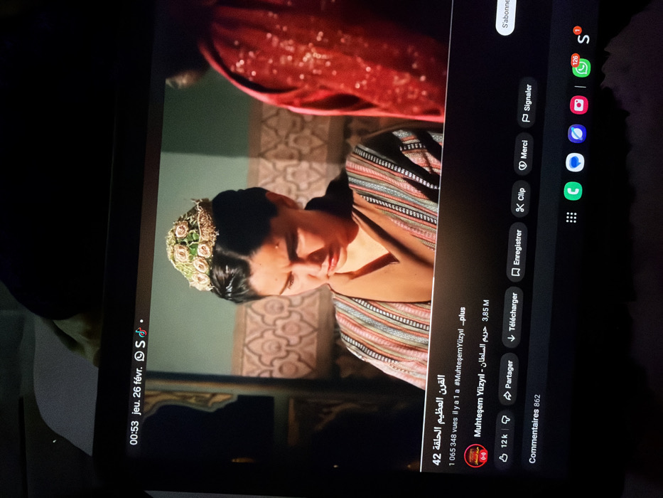 A digital screen, possibly a tablet or laptop, is depicted in a dimly lit interior. The screen displays a YouTube video player, showing a historical drama identified as "القرن العظيم الحلقة 42" (The Magnificent Century Episode 42). The video features a young woman with dark hair styled upwards, wearing a conical, ornate headdress primarily green and gold with floral patterns. She has a somber expression, looking downwards. Her attire includes a brown V-neck top and an outer garment with horizontal multicolored stripes. To her right, partially visible and out of focus, is another individual wearing a textured red garment. The background within the video shows an interior wall with a repeating patterned motif. The screen's user interface indicates the current time as 00:53 on Thursday, February 26. Icons for WhatsApp, Snapchat, and TikTok are visible in the top status bar. The YouTube player overlay shows the video has 1,065,348 views, uploaded "1 year ago," and is from the "Muhteşem Yüzyıl" channel with 3.85 million subscribers. Interaction buttons include "12K" likes, share, download, save, clip, thanks, and report options, along with 862 comments. The device's bottom navigation bar displays icons for a launcher grid, phone, messages, Samsung Notes, camera, WhatsApp (showing 126 notifications), Snapchat, and TikTok (showing 1 notification). The environment surrounding the screen is dark and out of focus, with an indistinct light-colored object visible at the top edge of the frame. This image depicts a screen being viewed, ostensibly in Dar Bouazza, Morocco, though no specific visual elements within the image confirm this geographical location.