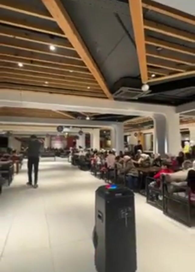 wide shot of a large, well-lit interior space, possibly a cafeteria or event hall, where numerous people are seated at tables. Most of the people appear to be adults, with some wearing hijabs or headscarves, suggesting a culturally specific gathering. The seating is arranged in rows, indicating an organized event or presentation. At the front of the room, to the left, a man in dark clothing stands and appears to be speaking or addressing the seated individuals. To the right of the frame, a black speaker with colorful lights at the top is positioned. The space has a modern design, with white walls, a tiled floor, and a wooden beam ceiling structure. There are overhead lights and decorative elements throughout the space.