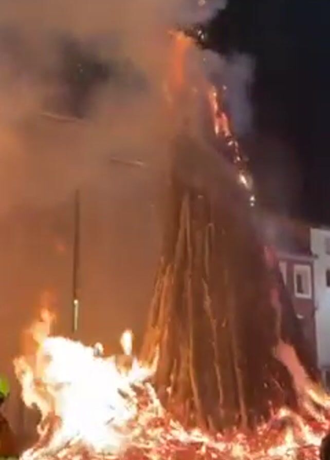 At night, a very large bonfire burns in a public square. The bonfire is constructed of branches or logs, and reaches a height of many stories, with smoke billowing above it. Sparks fly outward. A firefighter in full gear stands to the left of the frame, observing. A person in a yellow vest is partially visible at the right, near a barricade. The flames are intense, lighting up the wet ground. A tall building stands behind the fire.