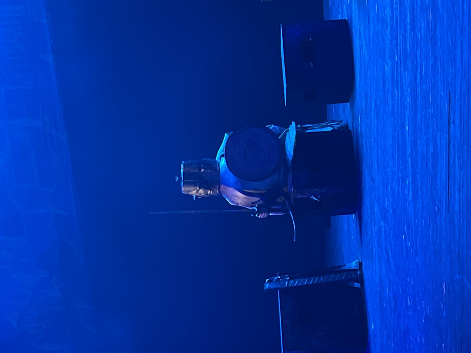 The image depicts a theatrical stage scene in Novoshakhtinsk, Russia, illuminated by deep blue lighting