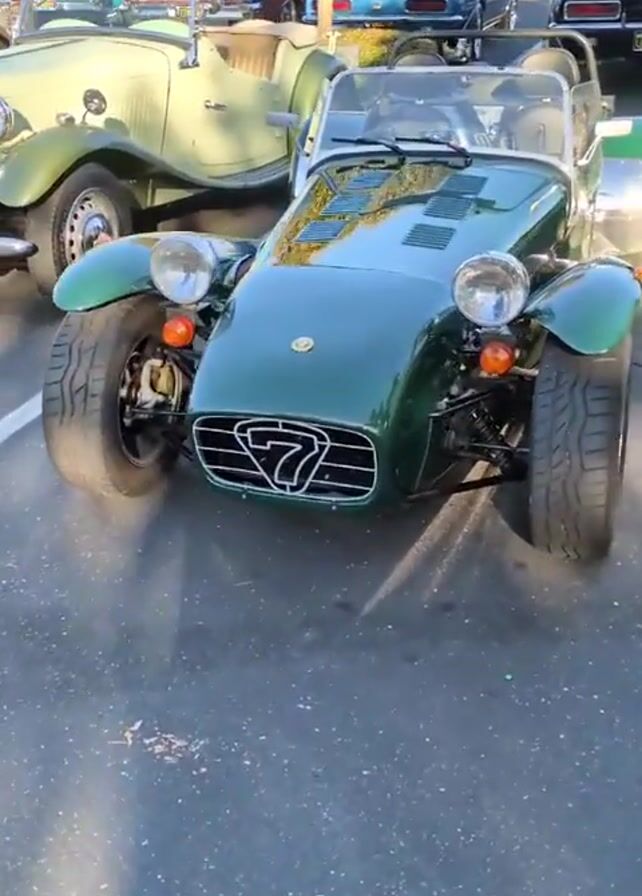 green Lotus Seven parked in a parking lot. The car is surrounded by other classic cars. The Lotus Seven has a white "7" on the front grill and side. The car has exposed exhaust pipes running along the side. The car is parked on asphalt in the sunlight. There are no people visible in the video.