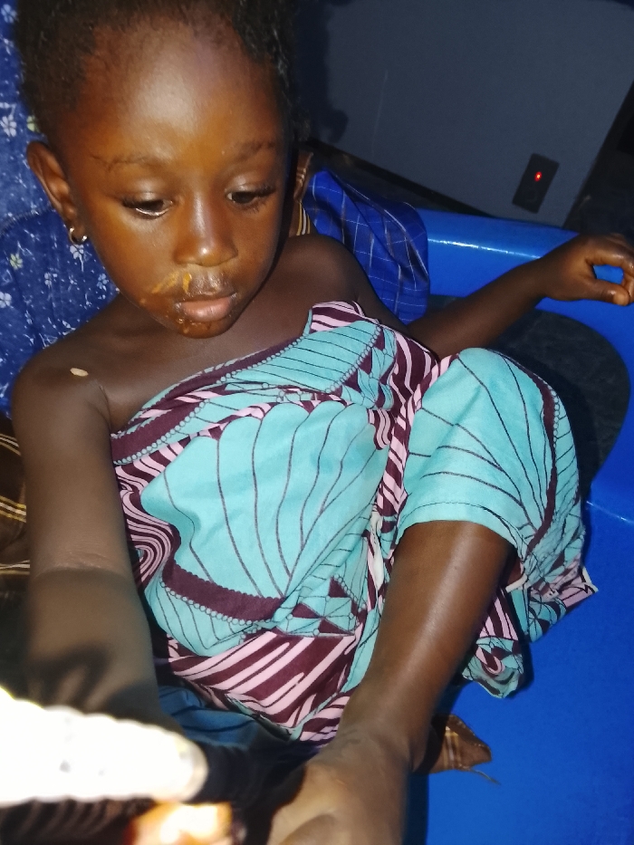 A young, dark-skinned child sits in a bright blue chair, draped in a patterned blue and maroon fabric. The child wears small earrings and has food remnants around the mouth. The child looks downwards, seemingly resting. A blurry hand and sleeve appear in the lower left corner. The background includes a dark wall with a visible electrical outlet. Other patterned fabrics surround the chair.