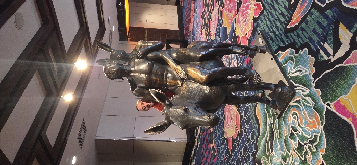 A bronze sculpture depicts a donkey carrying two figures, a man and a woman. A person in an orange shirt is seen behind the donkey. The sculpture stands on a triangular base against a carpet with a floral and geometric pattern. The background includes interior architectural details, such as patterned wall paneling and lighting fixtures. The image is shot in a well-lit indoor space.