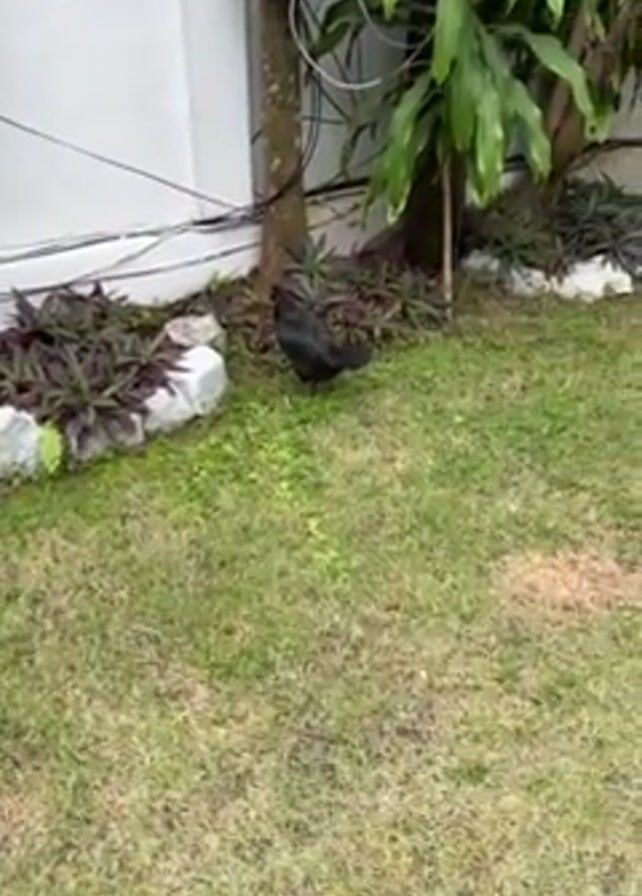 A backyard with grass, a white wall, plants, and a black rooster is shown. The rooster is near the tree and the edge of a garden. A child says "Oi galo" ("Hi Rooster").