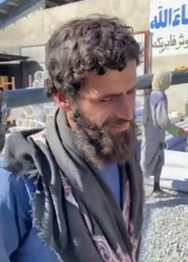 man with dark curly hair and a beard. He is wearing a blue shirt and a dark scarf with a patterned design. The man is looking off to the side, seemingly observing something. Behind him, there are stacks of white pipes and people are visible in the background. The area appears to be a storage yard or industrial area, with a building visible in the background. There is writing on the building above the pipes in the background. The ground is covered in gravel.