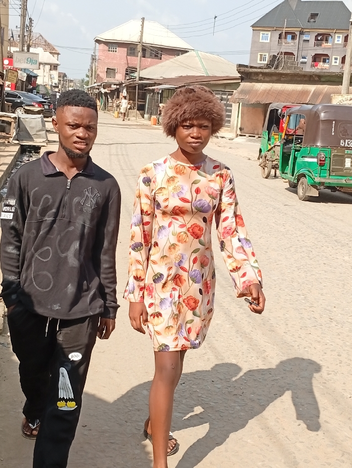 This image presents an urban street scene in ARIDICA, Nigeria, under bright daylight conditions. In the foreground, two individuals with dark complexions are positioned facing the camera. On the left, a young adult male with short dark hair and a beard wears a black long-sleeved polo shirt with a white 'NY' logo and black track pants featuring a white ghost graphic with "BOO!" text; his right hand is in his pocket, and his facial expression is characterized by a slight grimace. On the right, a young adult female with voluminous, frizzy brown hair wears a long-sleeved, short floral dress featuring multi-colored botanical patterns on a light background; she holds a small, dark cylindrical object in her right hand, and her expression is neutral. Both individuals are wearing dark flip-flops. The background depicts a paved street lined with diverse buildings. To the left, several parked vehicles, including a dark sedan, are visible near commercial structures, one prominently displaying a "Bet9ja" sign. The street extends into the distance, revealing a mix of multi-story residential buildings and single-story commercial establishments with corrugated metal roofs. To the right, a green and brown motorized tricycle (keke napep) with a partially visible license plate "B 13" is present on the roadside. Overhead power lines crisscross the sky. Shadows of the foreground individuals are distinctly cast on the street surface. A drainage channel is visible along the left side of the road.