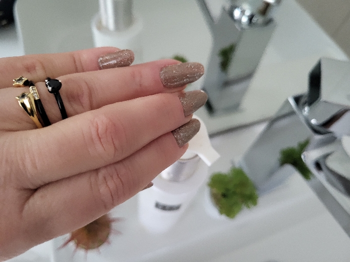 The scene is set in a bathroom within Vila Nova de Famalicão, Portugal. A human hand, with manicured fingernails painted in a sparkling light brown or taupe glitter polish, is positioned over a white ceramic sink basin. The hand wears two rings on the ring finger: one gold-toned with a star and a dark gem, and another black with a dark heart-shaped gem. In the blurred background, a chrome faucet, a white pump dispenser (likely for soap or lotion), and another larger white bottle are visible. Small green plant-like decorative elements are placed near the faucet and behind the dispenser. A spiky, brown natural decoration is situated in the lower-left portion of the sink area. Reflections of the faucet and green decor are present on a reflective surface behind the sink.