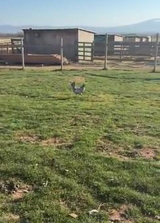 single chicken walking across a grassy field on a clear, sunny day. The chicken has gray and white speckled feathers. In the background, there are several wooden structures that appear to be sheds or enclosures, surrounded by wooden fences. Beyond the structures, a mountain range is visible in the distance under a bright blue sky. The grass in the field is green with patches of brown. The camera follows the chicken as it walks, maintaining a mid-range shot.