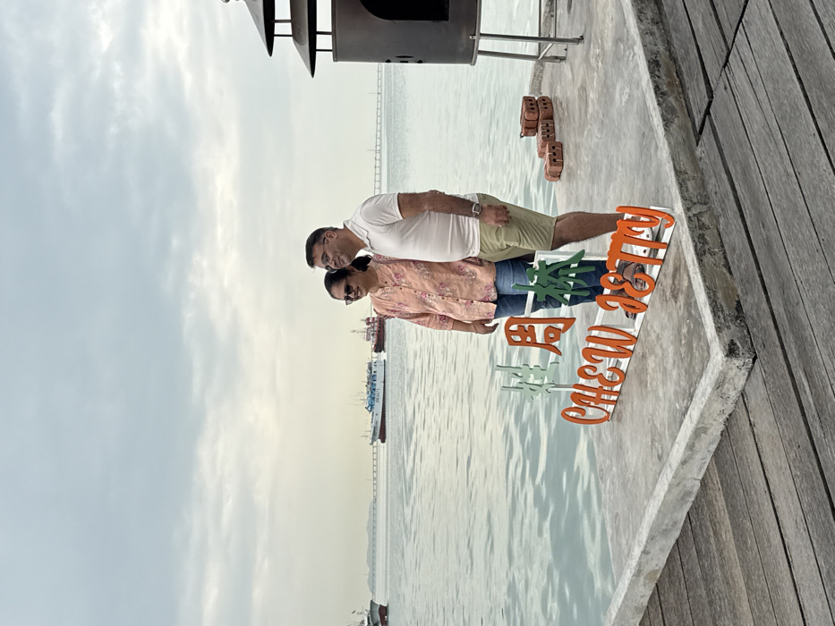 An outdoor, overcast scene shows a man and a woman posing beside a sign that reads "CHEW JETTY" in orange letters and Chinese characters in green
