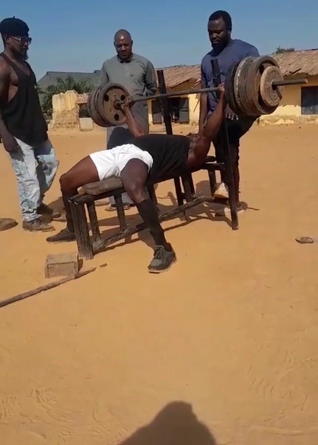 A man is bench pressing a heavy barbell with large, rusty weights, assisted by two spotters. A third man is standing nearby, watching. They are on a dirt lot with simple buildings in the background. The bencher is wearing a black shirt and white shorts, and one spotter is in a gray shirt and the other in a blue shirt. All the men appear to be Black. The setting is outdoor on a sunny day.