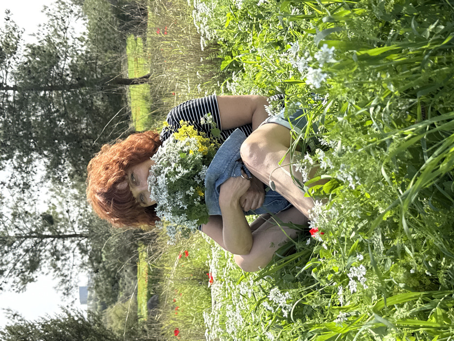 - "A female individual with red, curly hair and bangs is seated cross-legged amidst a dense field of green grass and wildflowers under clear daylight" by FM-XR4443, licensed under CC BY 4.0