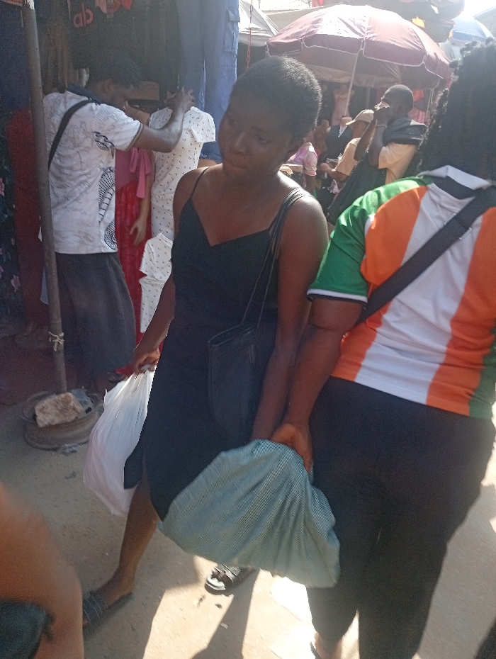 In a crowded outdoor market, a young woman in a black dress and carrying a shoulder bag walks with heavy bags. A person next to her wears a shirt with orange and green stripes, black trousers, and a bag strap. In the background, a man adjusts clothes on a mannequin, and others stand under an umbrella.