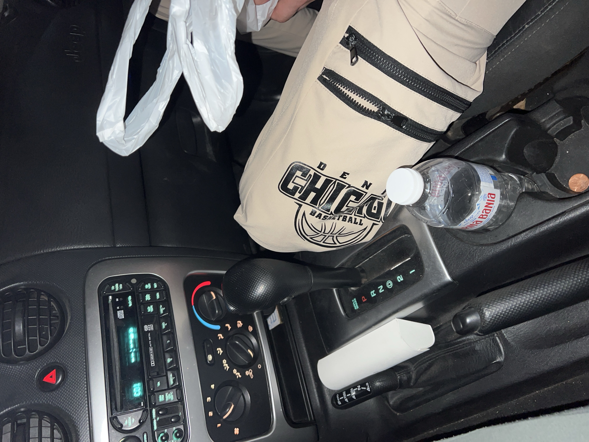 The image depicts the interior of a vehicle, specifically the passenger-side dashboard, center console, and a portion of the front passenger's lap, located in Kornitsa, Bulgaria. The dashboard features two circular air vents and a red triangular hazard light button. Below these, a silver-trimmed audio unit displays "CD1" on its blue-lit screen, flanked by various controls for radio and disc functions, including "DOLBY B NR AUTO METAL." Below the audio unit is a climate control panel with three black rotary knobs and additional buttons; red and blue indicators are visible around one knob. A subtle "Jeep" logo is embossed on the passenger airbag cover. The center console presents a black automatic gear shifter, currently in the "P" (Park) position, with visible selections for P, R, N, D, 2, and 1. To its left is a smaller black shifter, likely for a four-wheel-drive system, showing positions such as 2WD, 4WD, N, and 4LO. A white, rectangular object rests horizontally between these shifters. A black, textured handbrake lever is positioned to the right of the main gear shifter. A person's leg, clad in beige cargo-style pants with black zipper pockets and a "CHICAGO BASKETBALL" graphic, is visible on the passenger side. A white plastic shopping bag, appearing lightweight and crumpled, is draped over this leg. A clear plastic bottle of "ДАРНИ БАНИЯ" (DARNI BANIYA) branded water is secured in a cup holder in the center console, alongside a copper-colored coin.