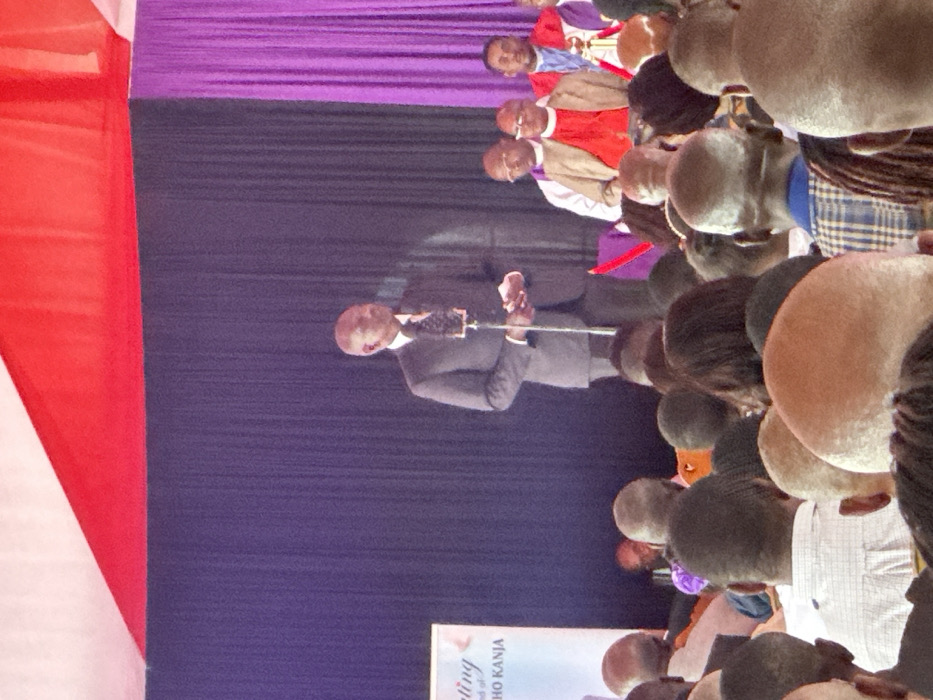 The image depicts an indoor or covered public event taking place in Nanyuki, Kenya. A bald, dark-skinned adult male, dressed in a dark suit, white collared shirt, and patterned tie, stands center-frame behind a silver-colored microphone on a stand. He is facing slightly to the right of the viewer's perspective, with his left hand holding a small, light-colored object, possibly notes or a phone. Behind the speaker, a dark blue-purple pleated curtain serves as a backdrop. To the right of the stage area, additional purple pleated curtains are visible. Above the stage, a temporary ceiling structure is adorned with red and white fabric drapes. To the right and slightly behind the main speaker, several adult males are seated. At least three individuals are visible; two are wearing religious vestments, including one with a red tunic beneath a light-colored jacket and a purple stole, and another in a purple robe with a gold-colored stole. To the left of the speaker, a white vertical banner is positioned, displaying partial black text that reads "elling" and "HO KANJA." The foreground of the image is occupied by the backs of numerous heads, indicating a seated audience observing the proceedings on stage. The audience members exhibit various hair types, including many bald or closely-shaven heads. The overall lighting is bright and even.