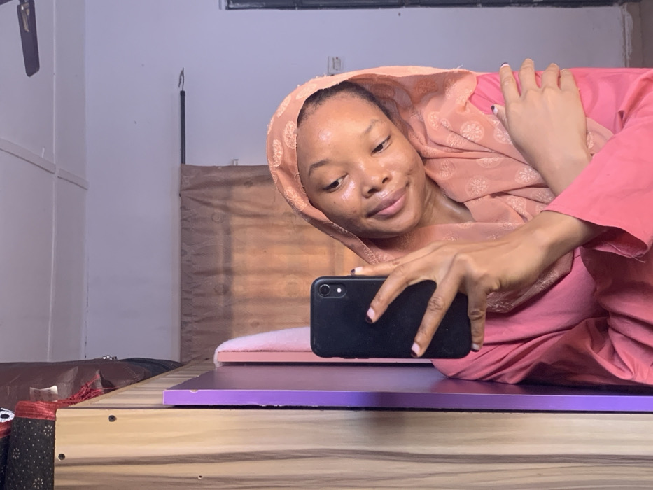 A female individual is depicted in a mirror selfie, captured indoors in Ilorin, Nigeria