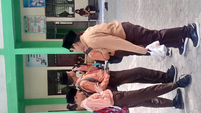 Three uniformed students stand in a row, all wearing brown pants and different colored shirts, topped with traditional black caps. Two are looking at their phones, while the student at the top is holding a white plastic bag. Another student sits on a bench behind them. The background consists of a green wall with educational posters and windows. The flooring has a textured, tile-like pattern.