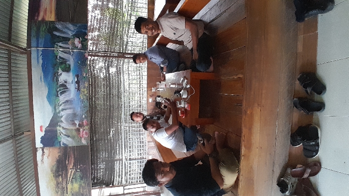 Six adult males are observed in a semi-open traditional seating area located in Keudealue Ie Puteh, Indonesia