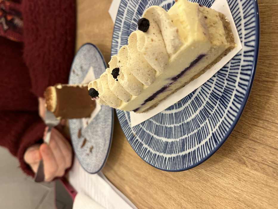 This forensic image depicts an indoor scene in the City of Zagreb, Croatia, at what appears to be a café or dessert shop. In the foreground, a rectangular slice of cheesecake, featuring a blueberry swirl within its white body and topped with five piped swirls of light-colored cream, each adorned with a small dark blueberry, rests on a white paper liner atop a blue and white patterned ceramic plate. This plate is positioned on a light wooden table. In the midground, slightly out of focus, a second matching blue and white patterned plate holds a partially consumed rectangular chocolate cake, topped with a lighter cream layer dusted with cocoa powder. A person's hand, wearing a dark red knitted sweater, holds a silver fork, positioned above the chocolate cake, indicating an ongoing action of eating. To the left of the hand, a pink-cased smartphone and a white piece of paper are visible. The person's upper torso, also clad in the dark red sweater, is seated across the table in the background.
