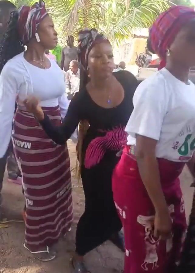 group of adults and children, who appear to be in a parade. The camera is held horizontally and follows a group of three women as they move slowly. Each woman wears a white top and a red and white striped head wrap and skirt. The woman on the left wears a white long-sleeved shirt and carries a white purse. The woman in the center wears a black long-sleeved shirt with a pink design, and the woman on the right wears a white t-shirt. Behind the women is a row of people and a speaker system. The scene takes place outside, with trees and bright sunlight in the background. An "Infinix NOTE 30 Pro" watermark appears on the bottom left of the screen.