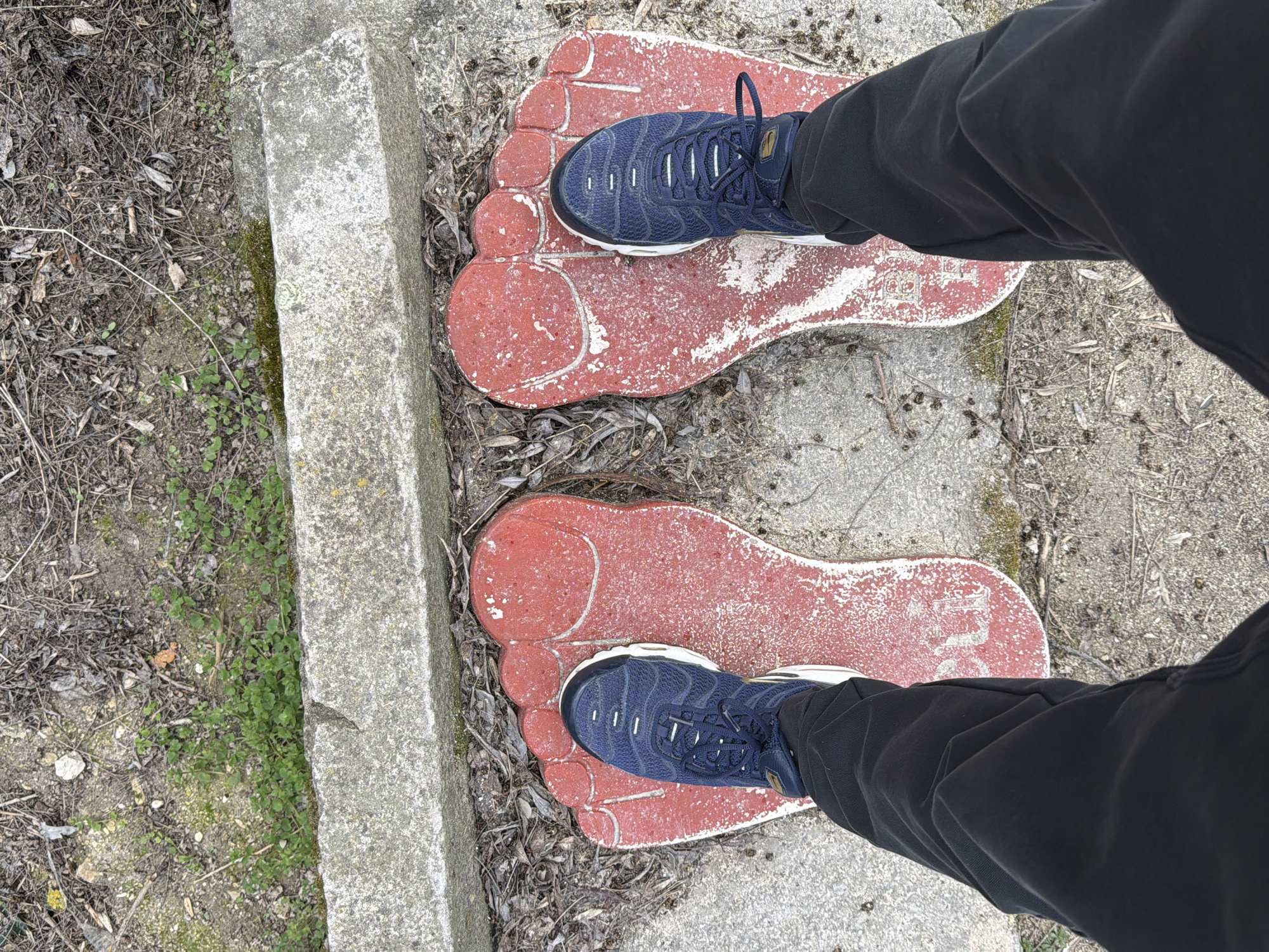 An overhead photograph depicts a person's feet, clad in dark blue athletic shoes with white soles and black trousers, positioned atop two large, red-painted foot outlines on a concrete surface