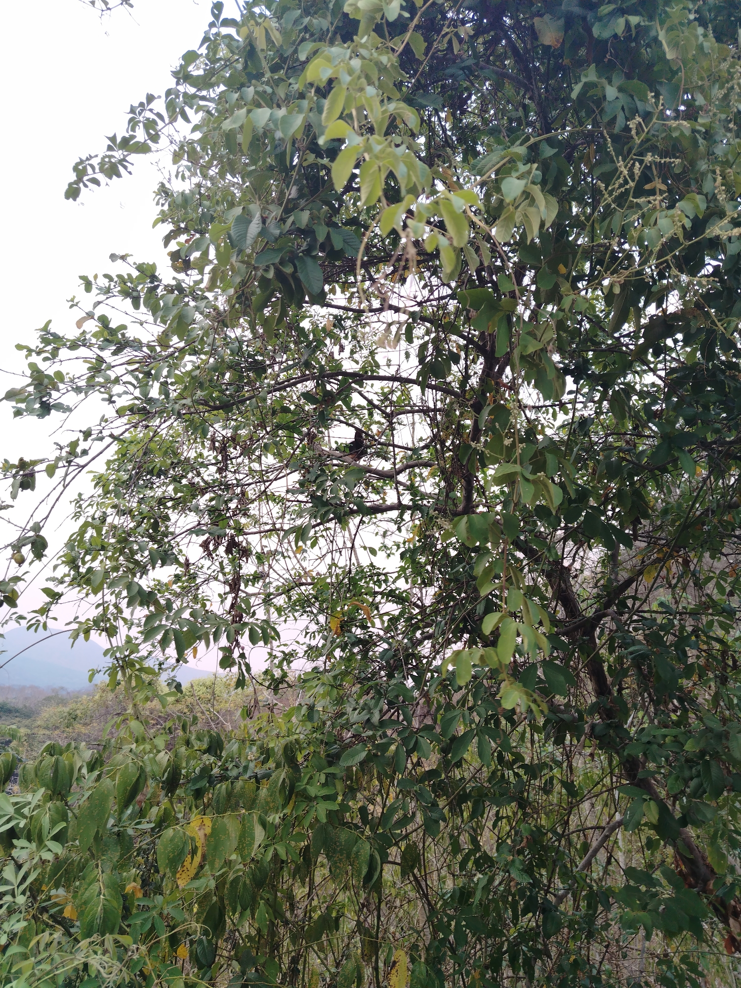 The image captures a dense, natural vegetative scene in Los Leoncitos, Venezuela, dominated by a tree canopy. The foreground is filled with various shades of green foliage, including broad leaves, smaller leaves, and numerous thin branches and twigs. Some leaves exhibit lighter green or yellowish tones. Small, light-colored clusters of flora (possibly flowers or berries) are visible throughout the branches. Two dark-feathered birds are identifiable within the upper-middle section of the foliage; one is perched, facing left, while the other is partially obscured behind it. The upper portion of the frame reveals a bright, overcast sky through gaps in the leaves. In the distant background, hazy, vegetated hills or mountains are discernible beneath the pale sky. No human figures or man-made structures are overtly present in the immediate vicinity.