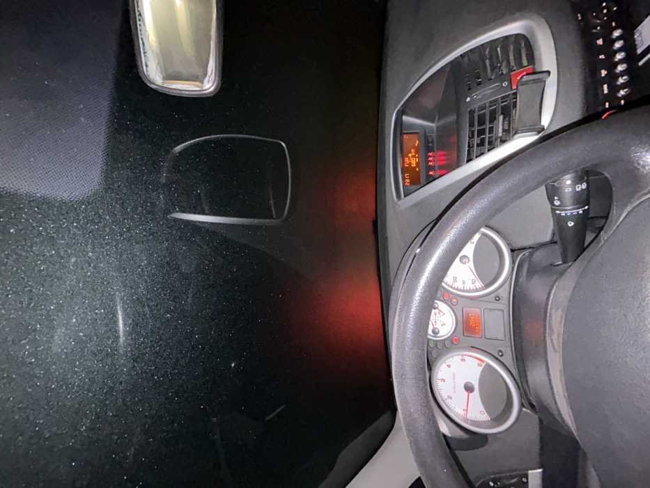 An interior car view, angled vertically. The dashboard and steering wheel dominate the right side. Speedometer gauges are visible. A digital display shows numerical information. The center console and air vents are also present. To the left, the windshield has a rearview mirror and some kind of sensor on it. The scene is dimly lit.
